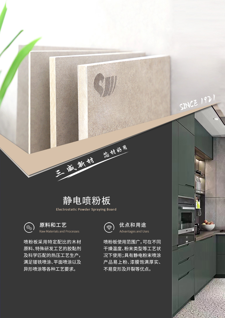 静电喷粉板基材在静电粉末喷涂加工中质量稳定,不开裂,漆膜饱满密实,物理加工性能优良,支持异形设计(如免拉手)。加工而成的喷粉板具有零甲醛、无污染、无VOCs等有害物质释放,耐磨且抗敲击,无需封边设计,六面无缝喷涂工艺,成品整体性强,而且兼具防水防潮功能。